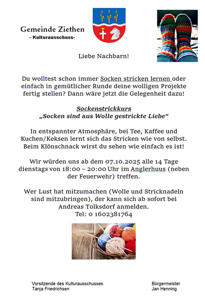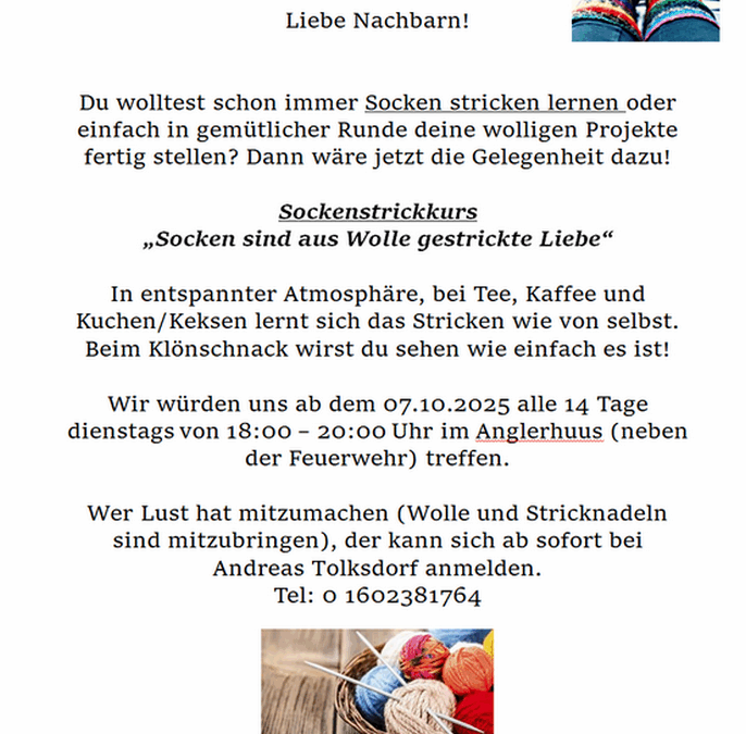 Stricktreff im Anglerhuus 16.09. 2025 Termin Details Dieser Termin läuft vom 7 Oktober 2025 bis 24 März 2026 und findet das nächste Mal am 16. Dezember 2025 18:00 statt. Ort: Anglerhuus Ziethen Kommende Daten: 16. Dezember 2025 18:0030. Dezember 2025 18:0013. Januar 2026 18:0027. Januar 2026 18:0010. Februar 2026 18:0024. Februar 2026 18:0010. März 2026 18:0024. März 2026 18:00